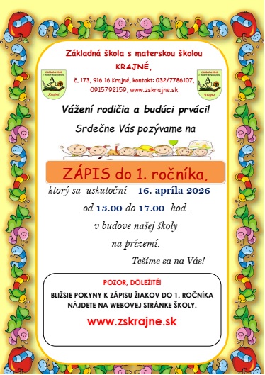 Zápis žiakov do 1. ročníka sa koná v dňa 16. apríla 2026 v čase 13.00 - 17.00 v budove Základnej školy  s materskou školou Krajné.